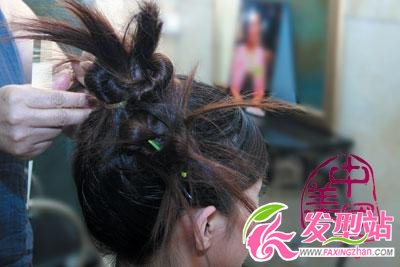 2.將卷好的辮子在1/3處打彎,用辮尾將頭發(fā)緊緊地繞起來,然后用卡子固定。