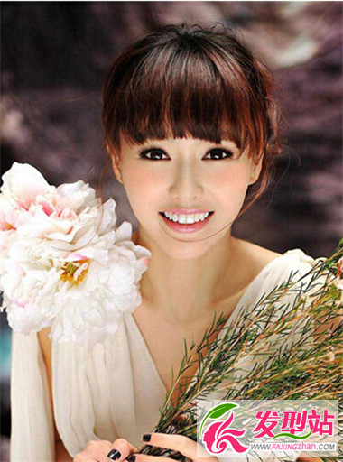 很是唯美的這款發(fā)型十分的適合新娘拍攝結(jié)婚照時(shí)的選擇,稍微內(nèi)扣的劉海很好的修飾了臉型,精致盤(pán)發(fā)留下幾許的發(fā)絲顯得俏皮甜美。