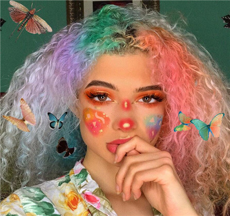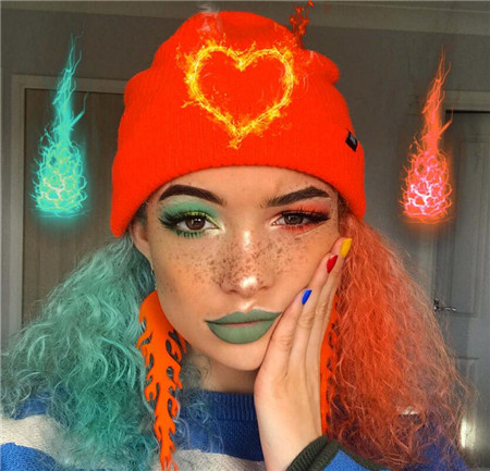 淺藍(lán)色和橙色的拼染設(shè)計(jì),一邊一半,溫柔浪漫。發(fā)際線兩邊的劉海各編織個(gè)小小的麻花辮,別上小孩子的發(fā)飾,神秘且甜美十足。