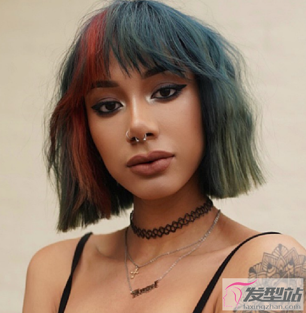 不得不說,如此經(jīng)典的黑發(fā)和一刀切蛋卷發(fā)的組合真的很顯老。但劉海的極光綠挑染,讓整個(gè)發(fā)型鮮明個(gè)性了許多。