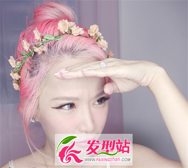 好看的女生染發(fā)設計NO.2:帶給大家一款小清新范十足的一款染發(fā)發(fā)型設計,將頭發(fā)染上桃粉色,在盤上一個發(fā)髻在腦后,帶上花環(huán)發(fā)飾,仿佛一個時尚的小精靈。