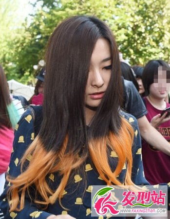 黑色和橘色的撞色對(duì)比,有那么一絲絲的非主流,從發(fā)色分界出開(kāi)始自然卷曲的發(fā)尾讓造型層次更加豐富,也減少了黑發(fā)帶來(lái)的沉重感,缺點(diǎn)是黃色的染發(fā)容易使發(fā)質(zhì)看上去干枯,沒(méi)有光澤。