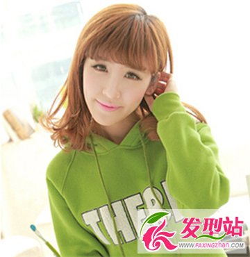厚重的齊劉海造型不僅可以增添女生的可愛(ài)甜美風(fēng),而且還有很好的修顏減齡效果哦,而配合溫暖的橘黃色染發(fā)與中短發(fā)形式的梨花燙造型更添活潑氣質(zhì)感。