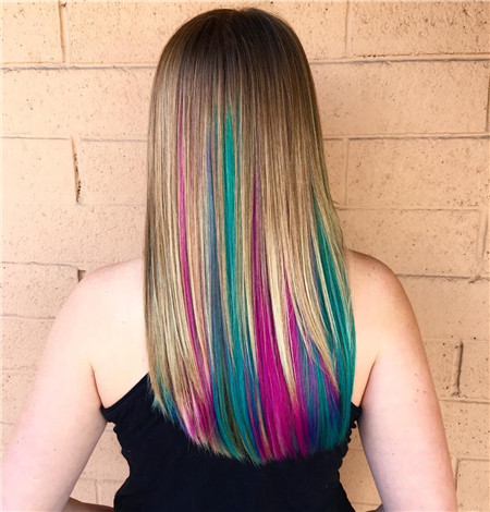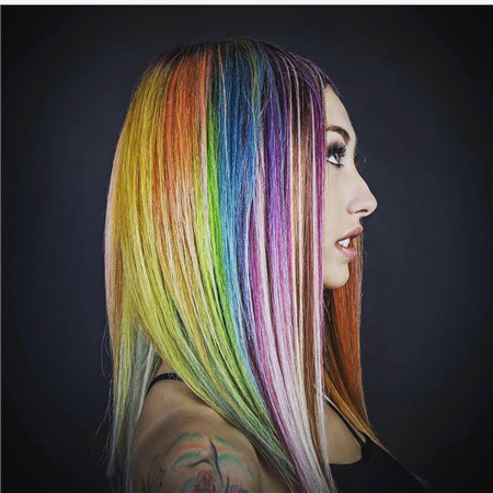 彩虹色染發(fā)設(shè)計(jì)的中長(zhǎng)直發(fā),紫藍(lán)綠黃的多色挑染,多量均等分量的發(fā)色,更添夢(mèng)幻和浪漫,女生更有童話中的美妙。