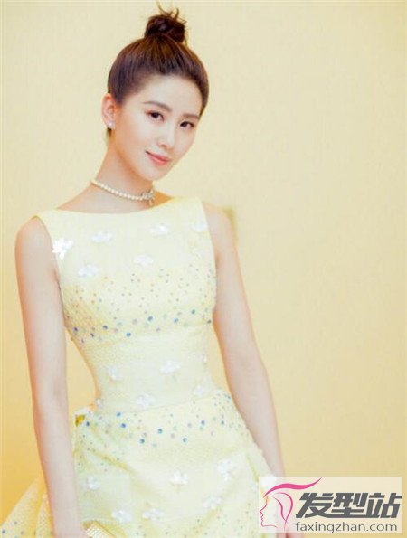 景甜的臉型屬于典型的鵝蛋臉,但是臉型比較大。把短發(fā)高扎個丸子頭,搭配黑色透視長裙,女人味滿分。