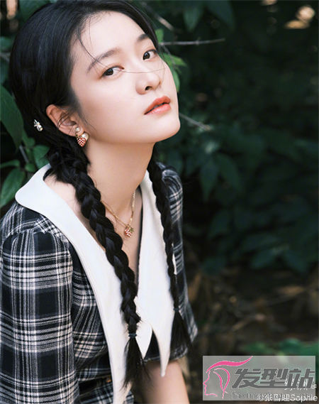 這一麻花辮造型好可愛啊,清純又動人。身穿格紋連衣裙俏皮又可愛,超元氣。