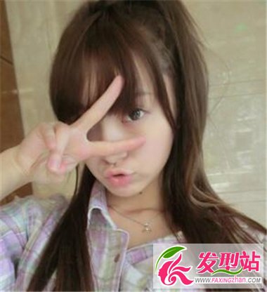 很可愛的嫩模感覺,可愛的半扎發(fā)造型,搭配上棕褐色的時尚染發(fā)和披肩的垂直造型,可愛的V手勢和淡紫色打扮,更加粉嫩。
