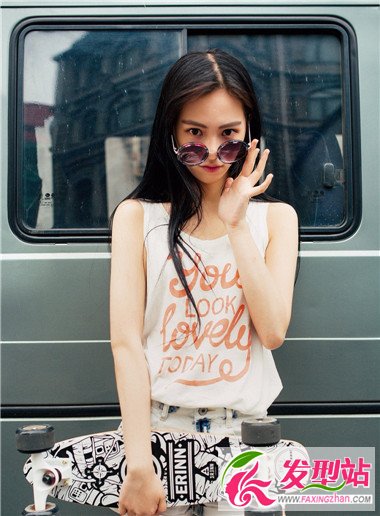 烏黑亮麗的長(zhǎng)發(fā),顯得皮膚十分白嫩。中分發(fā)線,使得臉型更加完美迷人。搭配時(shí)尚的太陽(yáng)鏡,給人一種純天然的時(shí)尚氣質(zhì)。