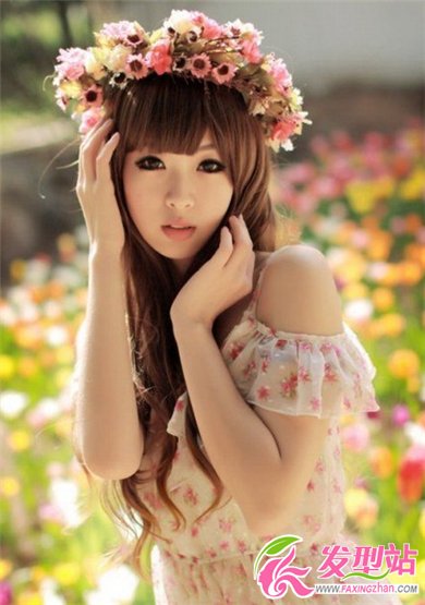 甜美的齊劉海突出精致水潤的大眼睛,棕色染發(fā)襯出白皙的肌膚,柔順的長卷發(fā)頭頂搭配一個漂亮的花環(huán),更加浪漫優(yōu)雅。