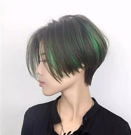 一款街拍時(shí)髦范兒十足的個(gè)性短發(fā)。深灰色的頭發(fā)中挑染幾抹綠色發(fā)絲,遠(yuǎn)遠(yuǎn)看著就立刻被吸引,需要注意這款短發(fā)的弧度感。
