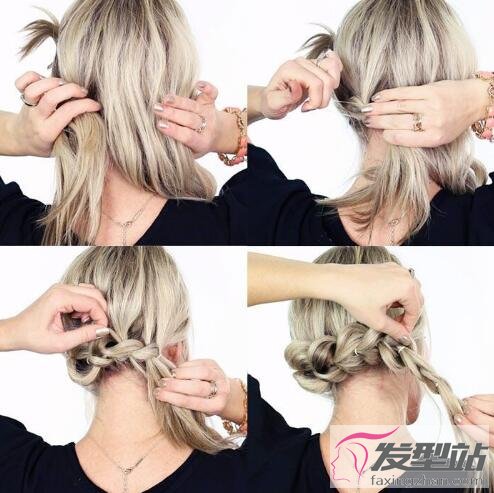 第四步:一個(gè)放在后一個(gè)發(fā)束的上方,下放的頭發(fā)從底部穿過,形成上下包住的造型
