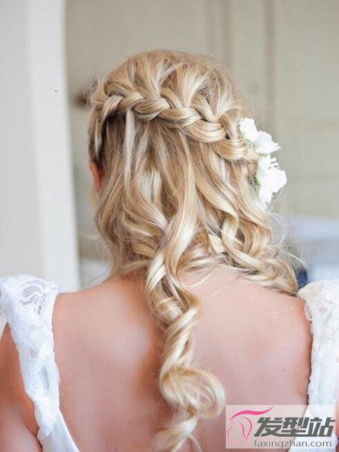 半扎發(fā)+麻花辮的發(fā)型,發(fā)型簡單容易學(xué)會,只要隨意抓取一部分的頭發(fā),分成三股編成麻花辮即可,染一個時髦發(fā)色更美哦!