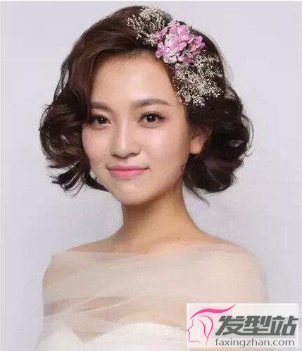 臉型比較圓潤的新娘可以試試這款短發(fā),將頭發(fā)燙出微微的卷曲,構(gòu)成了靈動的造型,很能彰顯發(fā)量,將臉側(cè)的頭發(fā)燙卷,搭配花朵發(fā)飾,起到了瘦臉作用。