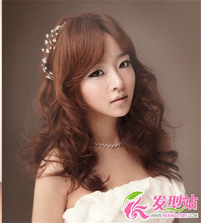 亮點(diǎn)點(diǎn)評(píng):浪漫的咖啡色長(zhǎng)卷發(fā)披散在肩頭,中分長(zhǎng)劉海修飾臉型,花藤造型的發(fā)飾點(diǎn)綴在浪漫的卷發(fā)中,高貴唯美。