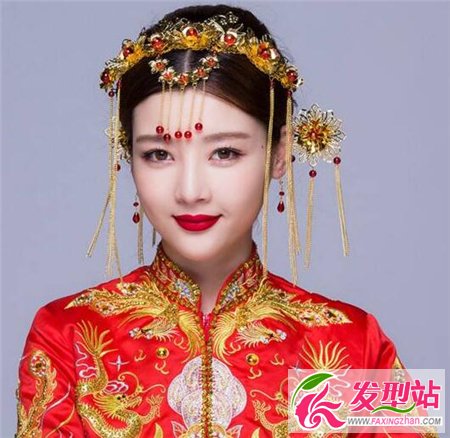 鳳冠霞帔的新娘造型是在很多電視劇中都看過,沒有過多復(fù)雜的盤發(fā),只是將發(fā)絲梳到腦后,盤成發(fā)髻,前額發(fā)絲處插上鳳飾,極具端莊大氣美。
