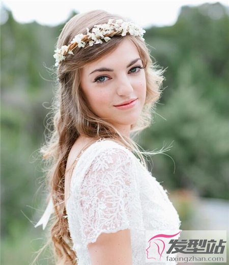 紅棕色染發(fā)不僅吸引人的眼球,而且襯托得肌膚白皙透凈,將長發(fā)燙卷更增添了嫵媚的味道,將額頭側(cè)邊的發(fā)絲編織成發(fā)辮,再用花環(huán)綠葉裝點(diǎn),很適合圓臉新娘。