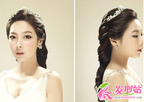 這款魚骨辮的新娘發(fā)型搭配著一個珍珠的皇冠,是不是很有選美皇后的感覺。高背的露額劉海全部都盤到頭頂了,這樣就凸顯出蓬松的質(zhì)感,后面自然垂順的馬尾給人一種清爽的感覺。