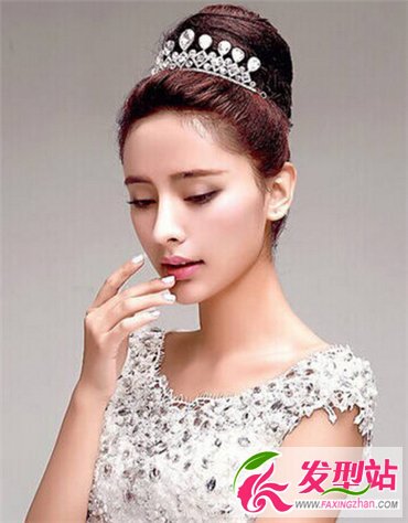 高發(fā)髻扎發(fā)很是顯高小個子新娘們可以考慮考慮,無劉海扎發(fā)加上皇冠的修飾,顯得優(yōu)雅十足,婚紗的搭配更是顯得高貴。