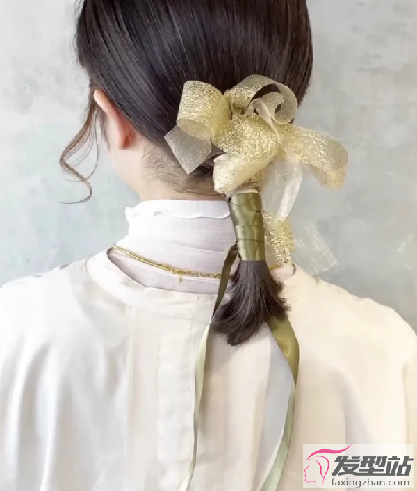 長馬尾半折疊起來,用發(fā)帶纏繞精致簡約,梳理得整整齊齊的馬尾很有森女氣質(zhì)。