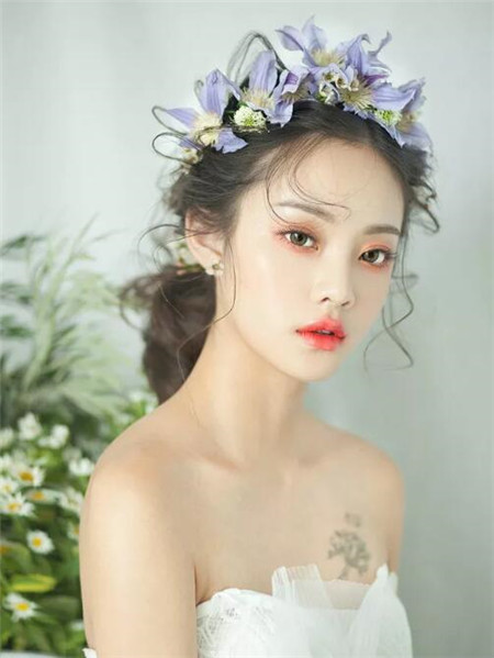 花環(huán)盤發(fā)新娘發(fā)型,頭發(fā)編織的辮子盤成幾個層次的造型,同樣是清新度十足的鮮花,浪漫點綴,添加浪漫感。