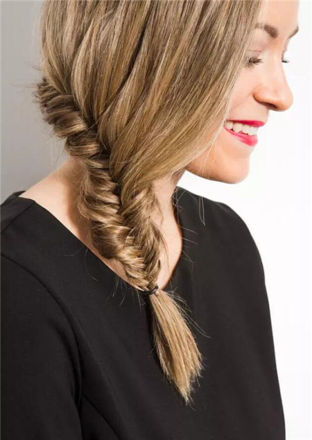適合中長發(fā)女生的一款編發(fā)造型,從另一側編到一側的設計,賢惠大方。