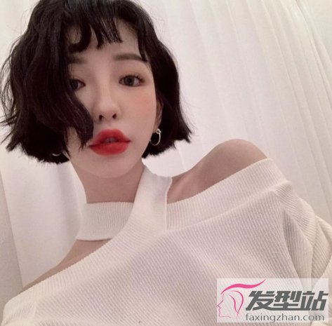 眉上劉海+短卷發(fā),給人一種酷酷的感覺,超級時尚個性,搭配露肩衣服的女生,又有一種小女人的嫵媚。