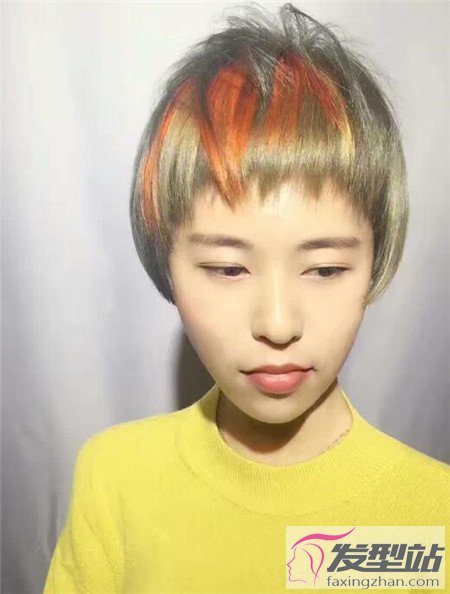 離子燙的短發(fā),閃著明亮的光澤。橘色的染發(fā)個性十足,加上發(fā)尾的粉色搭配。整個發(fā)型充滿了青春的美好氣息。