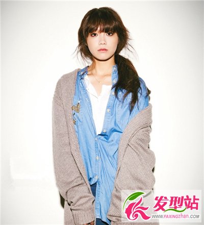 很酷很有型的一款韓式側(cè)邊扎發(fā),給人叛逆,不羈的感覺。稀薄的齊劉海,搭配深咖色的發(fā)色,不僅修顏瘦臉,而且也很好的提亮了膚色,整個造型簡單隨性,充滿魅力!