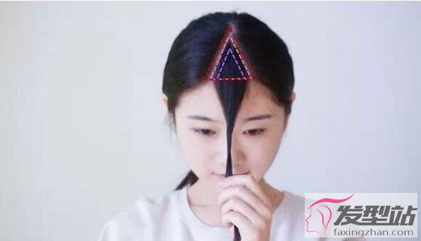 step 2:分出三角區(qū)。 注:這是整個剪發(fā)過程中最最關鍵的一步!將直接決定劉海的厚度和分散程度。這里我們將自己的三角區(qū)量化,便于大家比較。
