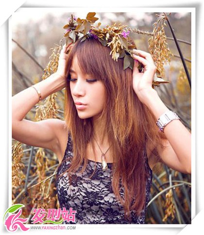 斜劉海中長(zhǎng)直發(fā)造型。直發(fā)造型簡(jiǎn)單易打理,漸變色的染發(fā)個(gè)性十足,搭配一個(gè)手工制作的花環(huán),很有feel。
