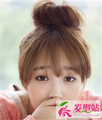 2015空氣劉海適合什么臉型呢?一頭棕色系的頭發(fā),簡(jiǎn)單的盤成了花苞頭造型,空氣感十足的齊劉海,搭配精致的瓜子小臉,清秀又利落。