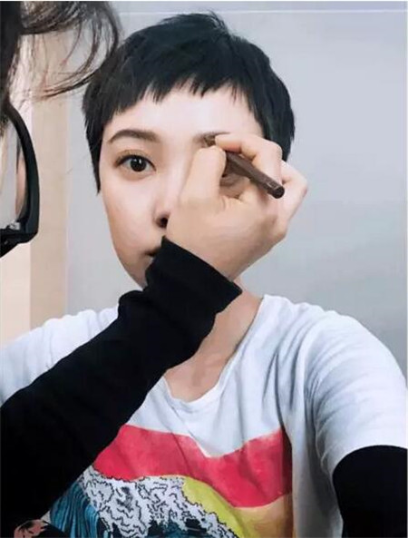 假小子風(fēng)范十足的超短發(fā),劉海整整齊齊的剪裁出狗啃狀,露出一半的額頭,黑色的頭發(fā)更突顯出她白皙的五官。