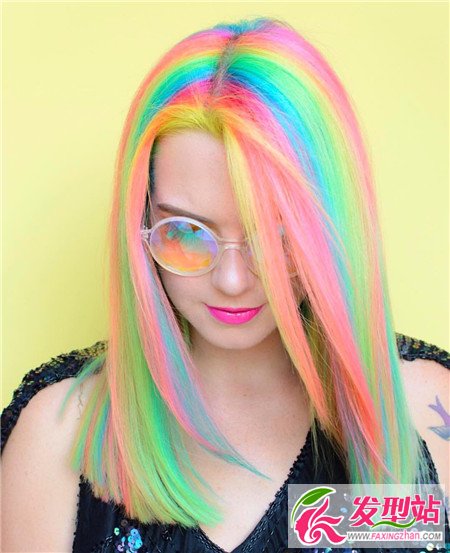 直發(fā)女人的發(fā)型,并不是簡約或者是清純類型的,也可以與眾不同。彩虹色均勻的染在中分發(fā)線兩邊,發(fā)型顯瘦更時髦。