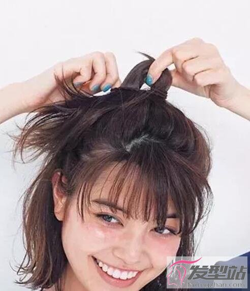 步驟4:到了這一步,這款及肩發(fā)半扎丸子頭就完成了。
