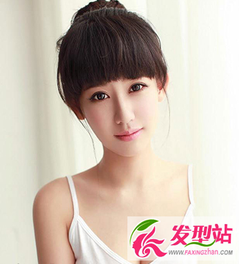 襯托了女生甜美氣質(zhì)的一款齊劉海丸子頭扎發(fā),厚重感的齊劉海遮住了額頭,修飾了女生略長的臉蛋。
