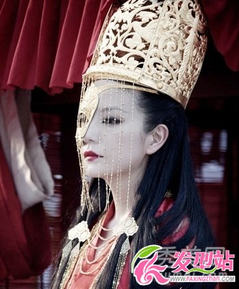 身披亮紅色新娘華袍頭戴金冠,妝容妖艷的趙薇,佩戴花紋繁復(fù)的金色面具,神秘且富于異域色彩。一頭烏發(fā)沒有過多修飾,只是整體向后簡單梳理,利落不拖沓,僅露出額頭就氣場逼人。