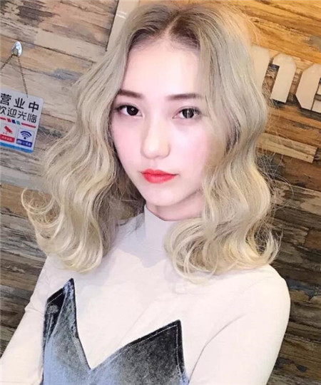 發(fā)色選擇淺灰白色,并且燙卷成卷密的大水波紋燙,整體發(fā)型就顯得女生成熟嫵媚許多。