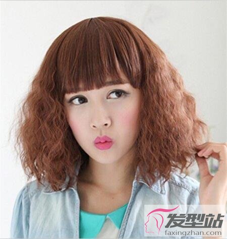 一頭短發(fā)采用玉米燙發(fā),時尚范十足,很能凸顯發(fā)量卻不會帶來厚重的感覺,層層疊疊的卷曲有著華麗的曲線美,長長的劉海修剪到齊眉的程度,映襯得女生的圓臉變得小巧玲瓏。