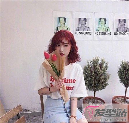 女生的臉型偏長,及肩發(fā)燙成泡面卷,稍顯凌亂的發(fā)絲充滿了自然隨性的味道。紅棕色染發(fā)既吸睛又與眾不同,顯白效果也是妥妥的。