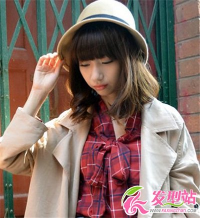 少女款齊劉海燙發(fā)造型,齊肩的梨花卷,甜美俏皮,時(shí)尚休閑著裝搭配,萌萌的女孩,一頂禮帽酷感十足。