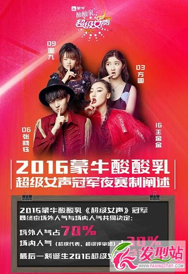 助陣嘉賓人選正式曝光,冠軍夜的賽制也全新出爐。據(jù)悉,總決賽第十場(chǎng)共分為四輪演唱,除超級(jí)代表與四強(qiáng)合作演出的第三輪外,每輪都將統(tǒng)計(jì)一次票數(shù),以決定最后的冠軍歸屬。“2016超級(jí)女聲冠軍夜”賽果將由場(chǎng)外人氣與場(chǎng)內(nèi)人氣共同決定。其中,場(chǎng)外人氣由粉絲貢獻(xiàn),占總?cè)藲獾?0%;場(chǎng)內(nèi)人氣由超級(jí)代表和超級(jí)評(píng)審團(tuán)共同決定,占總?cè)藲獾?0%。四輪結(jié)束,統(tǒng)計(jì)四強(qiáng)超女最終人氣排名,2016超級(jí)女聲總冠軍便榮耀誕生!
