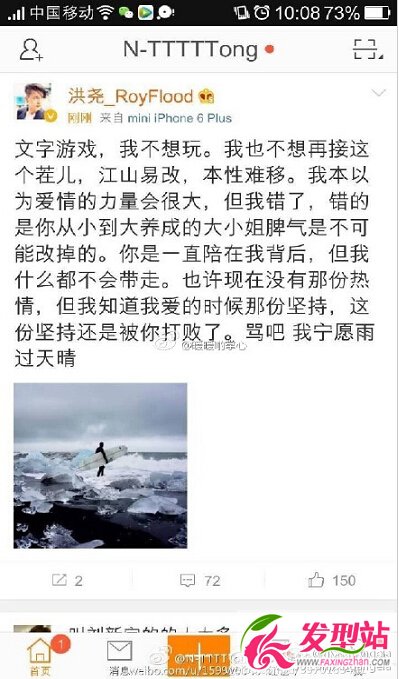 當(dāng)年《非常完美》上曹贏心一句:“我想和談一場不分手的戀愛。”俘獲了男嘉賓洪堯。一年多的戀愛里,兩人經(jīng)常秀恩愛自拍。就在大家都深陷兩人真愛的時(shí)候卻曝出兩人分手的消息。更狗血的是,隨之爆出了男方斥女方出軌的原文截圖,真是太狗血了,當(dāng)初那樣動情的告白了。但是被爆原文已經(jīng)被洪堯秒刪了。