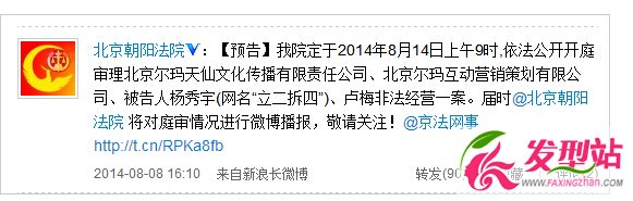 京華時(shí)報(bào)8月9日?qǐng)?bào)道 朝陽(yáng)法院昨天通過(guò)官方微博發(fā)出庭審預(yù)告,定于8月14日上午9時(shí)開(kāi)庭審理北京爾瑪天仙文化傳播有限責(zé)任公司、北京爾瑪互動(dòng)營(yíng)銷(xiāo)策劃有限公司、被告人楊秀宇(網(wǎng)名“立二拆四”)、盧梅非法經(jīng)營(yíng)案。屆時(shí)該院將微博播報(bào)庭審情況。