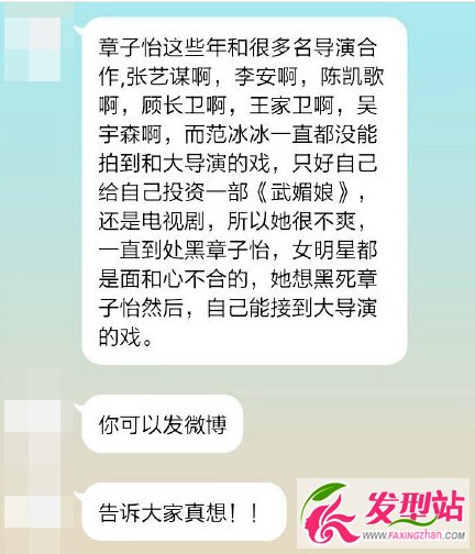 昨天,微博號“星扒皮”發(fā)布獨家粉絲爆料:“剛剛接到網(wǎng)友來信,爆料這些年一直黑章子怡的是被譽為炒作女王的某女星。小扒把對話記錄發(fā)出來給大家看看,僅供大家參考。至于是否真實,大家仁者見仁智者見智。我只是感覺,娛樂圈馬上就要血雨腥風(fēng)刀光劍影的撕逼了。坐等開年大戲出爐。章子怡會不會像霍思燕那樣的去圈某女星呢?” 同時,該博主還曬出一張爆料人與博主的私信聊天記錄的截圖。截圖顯示,這幾年黑章子怡的幕后主使疑是因嫉妒章子怡拍名導(dǎo)演電影的范冰冰。