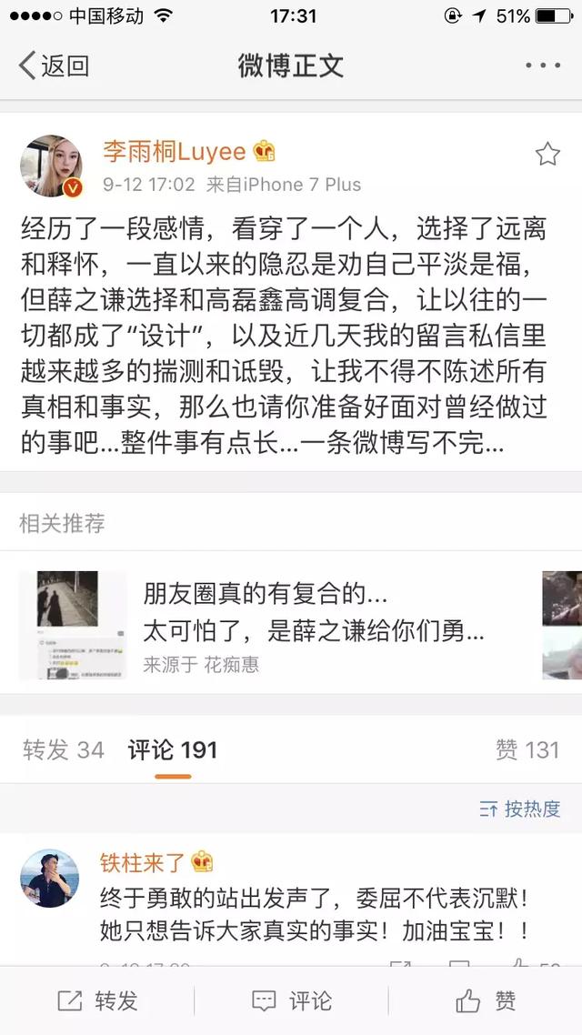 經(jīng)歷了一段感情,看穿了一個(gè)人,選擇了遠(yuǎn)離和釋懷,一直以來(lái)的隱忍是勸自己平淡是福,但薛之謙選擇和高磊鑫高調(diào)復(fù)合,讓以往的一切都成了“設(shè)計(jì)”,以及近幾天我的留言私信里越來(lái)越多的揣測(cè)和詆毀,讓我不得不陳述所有真相和事實(shí),那么也請(qǐng)你準(zhǔn)備好面對(duì)曾經(jīng)做過(guò)的事吧…整件事有點(diǎn)長(zhǎng)…一條微博寫不完…