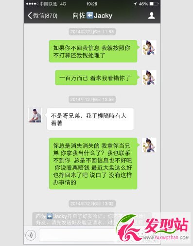 中國星集團主席向華強和向太陳嵐的兒子向佐欠債百萬不還?還被人PO出聊天記錄在微博上追債?近日,微博名為“電兔先生Eugene”的網(wǎng)友在微博爆料向佐向他借錢100萬一年來不歸還,還貼出了對向佐的追債聊天記錄。隨后,為娛樂圈操碎了心、疑與債主相識的王思聰為“電兔先生Eugene”的三條微博點贊,使得這場豪門追債的戲碼更為吸人眼球。截至發(fā)稿為止,新浪娛樂多次致電向太并發(fā)微博私信,對方并未回應。