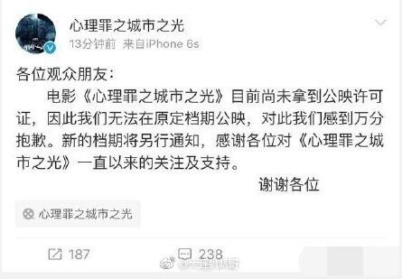 鄧超心理罪撤出國(guó)慶檔,由鄧超、阮經(jīng)天、劉詩詩主演的懸疑推理片《心理罪之城市之光》原定于9月30日上映,今天突然宣布撤出國(guó)慶檔,片方在官微上發(fā)布了撤檔消息,稱撤檔是因?yàn)闆]有拿到公映許可證。上映日期待定,但目前微博已被官方刪除,期待電影,期待新的定檔。