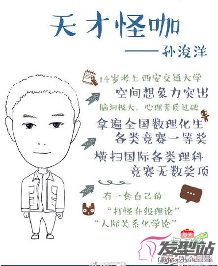 他叫孫浚洋,今年16歲。在新一季《最強(qiáng)大腦之燃燒吧大腦》全國(guó)百?gòu)?qiáng)大戰(zhàn)中,孫浚洋一亮相便牢牢鎖住大家的視線(xiàn),成為全場(chǎng)最有風(fēng)格化的選手,并成功晉級(jí)。這位以全國(guó)第16名的成績(jī)考入西安交大少年班的徐州天才少年,曾就讀于徐州解放路小學(xué)和礦大附中,從小資質(zhì)過(guò)人,1歲識(shí)字,一年級(jí)基本上自學(xué)完了小學(xué)課程,初三則完成了高中理科的全部?jī)?nèi)容,數(shù)學(xué)聯(lián)賽、生物、化學(xué)全是一等獎(jiǎng),亞洲杯數(shù)學(xué)金獎(jiǎng)(小學(xué)時(shí)),美國(guó)數(shù)學(xué)大聯(lián)盟杯一等獎(jiǎng),物理全球第11名……人生目標(biāo):涵蓋了腦洞所及的全部空間。興趣愛(ài)好:喜歡改編歌詞,抒寫(xiě)內(nèi)心史無(wú)前例的一切。未來(lái)女神:可以沒(méi)有一般意義上的美貌,但必須是一位能終身與我組隊(duì)打怪升級(jí)的伴侶。