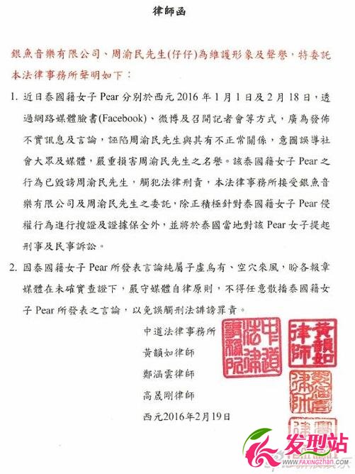 1.近日泰國(guó)籍女子Pear分別于西元2016年1月1日及2月18日,透過(guò)網(wǎng)路媒體臉書(shū)(Facebook)、微博及召開(kāi)記者會(huì)等方式,廣為發(fā)布不是訊息及言論,誣陷周渝民先生與其有不正常關(guān)系,意圖誤導(dǎo)社會(huì)大眾及媒體,嚴(yán)重?fù)p害周渝民現(xiàn)身之名譽(yù)。該泰國(guó)籍女子Pear之行為已毀謗周渝民先生,觸犯法律刑責(zé),本法律事務(wù)所接受銀魚(yú)音樂(lè)有限公司及周渝民先生之委托,除正積極針對(duì)泰國(guó)籍女子Pear侵權(quán)行為進(jìn)行搜證及證據(jù)保全外,并將于泰國(guó)當(dāng)?shù)貙?duì)該P(yáng)ear女子提起刑事及民事訴訟。