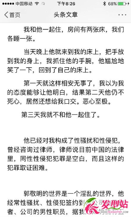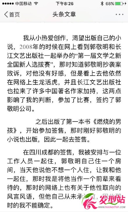在四川成都的簽售,我被安排與一位工作人員一起住,郭敬明自己住一個(gè)房間,當(dāng)天他說(shuō)他不想一個(gè)人住,讓我和他一起住,那時(shí)我是將他當(dāng)作一個(gè)前輩來(lái)看待的,那時(shí)的網(wǎng)絡(luò)上也有關(guān)于他性取向的風(fēng)言風(fēng)語(yǔ),但他自己從未承認(rèn)過(guò),因此那時(shí)的我不能確定。